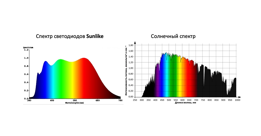 Высококачественный спектр светодиодов Sunlike обладает очень высоким индексом цветопередачи CRI=98 и практически полностью идентичен спектру солнечного излучения, к которому растения адаптировались за миллионы лет эволюции.